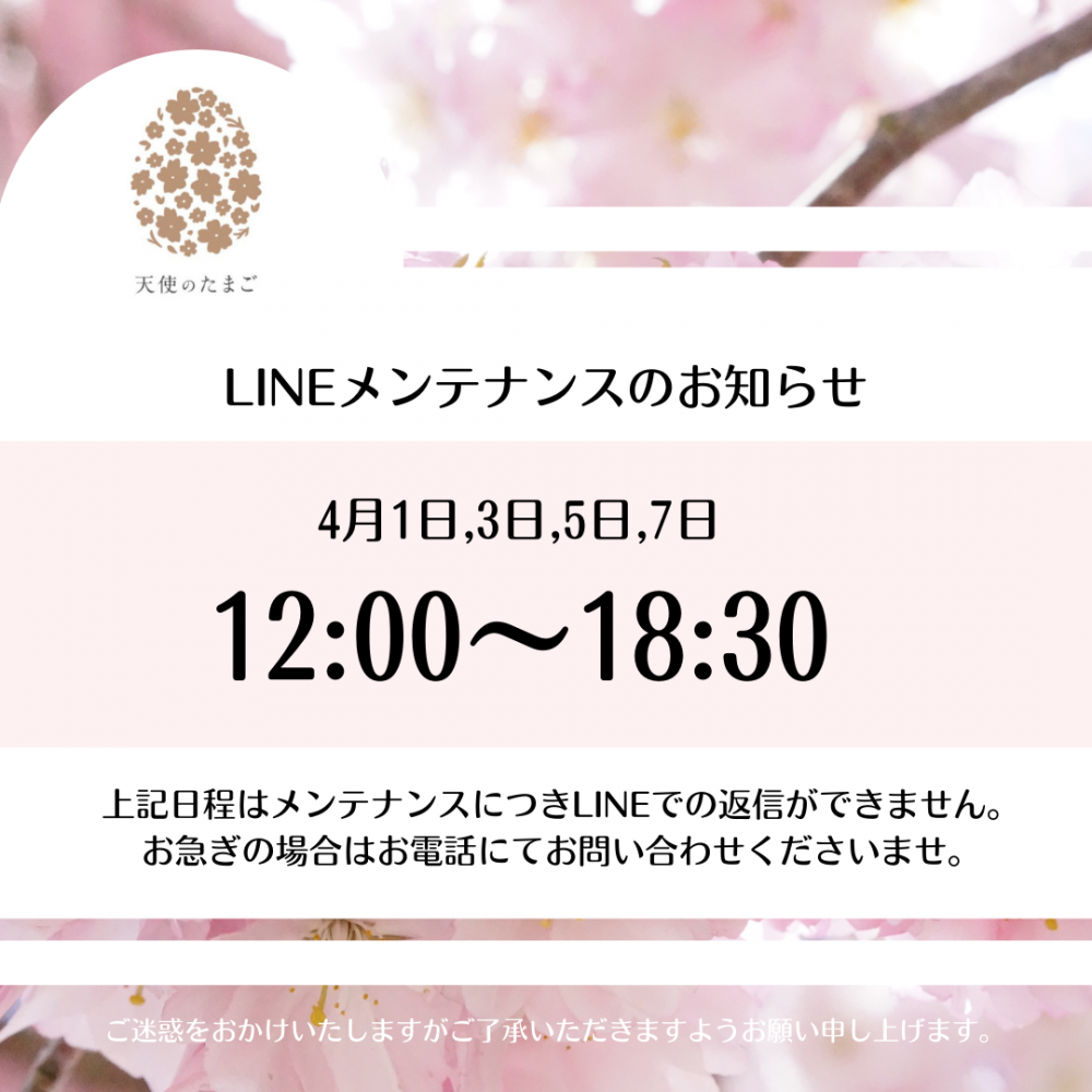 上記日程につきましては、天使のたまご公式LINE上でのメッセージのやりとりがおこなえませんので、ご予約などのお問い合わせはお電話・もしくはお問い合わせメールにてご連絡くださいますようお願い申し上げます。