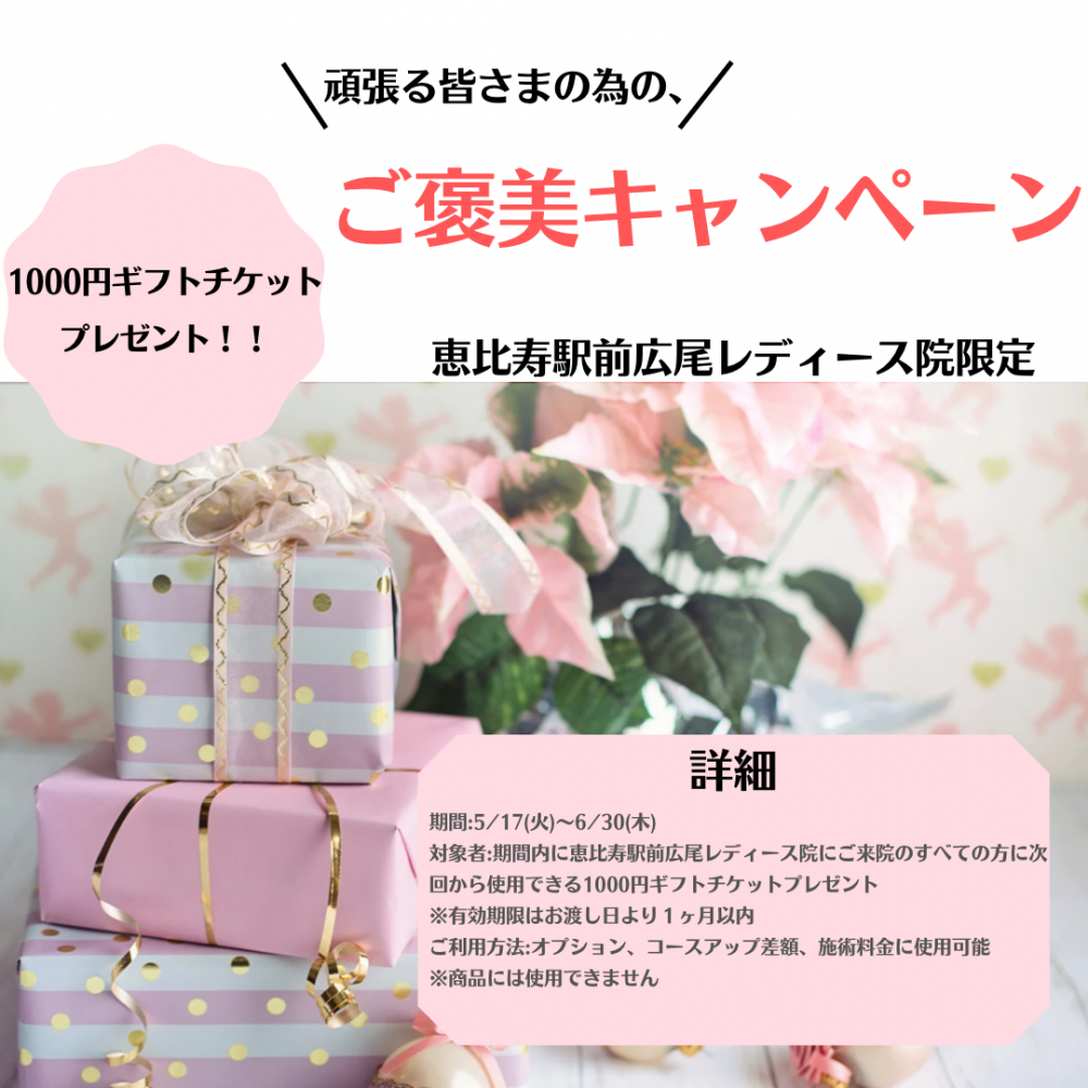 日頃、恵比寿駅前広尾レディースにご来院いただいている皆様に感謝の気持ちを込めて、1000円ギフトチケットをプレゼントさせていただくキャンペーンを行います。