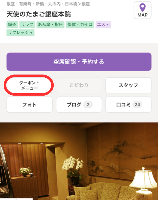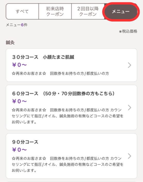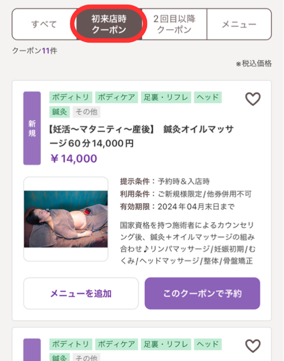 ➁画面上部のタブより、【初来店時クーポン】を選択後、ご希望のコースのクーポンをお選びください。