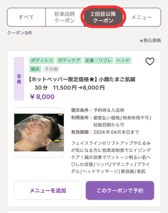 ➁画面上部のタブより、【2回目以降クーポン】を選択後、ご希望のコースのクーポンをお選びください。