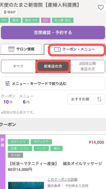 ②画面上部のタブより、「初来店時クーポン」を選択後、ご希望のコースのクーポンをお選びください。