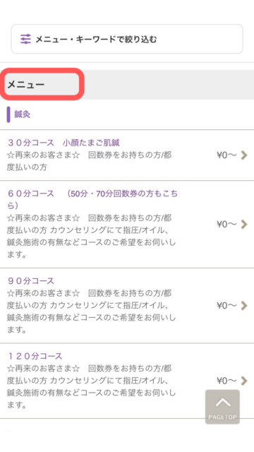②画面上部のタブより、【メニュー】を選択後、お持ちの回数券のコース時間をお選びください。