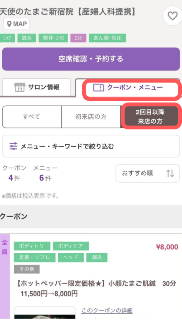 ②画面上部のタブより、【2回目以降クーポン】を選択後、ご希望のコースのクーポンをお選びください。