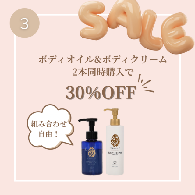 【内 容】ボディクリーム、ボディオイル2本ご購入で30%OFF