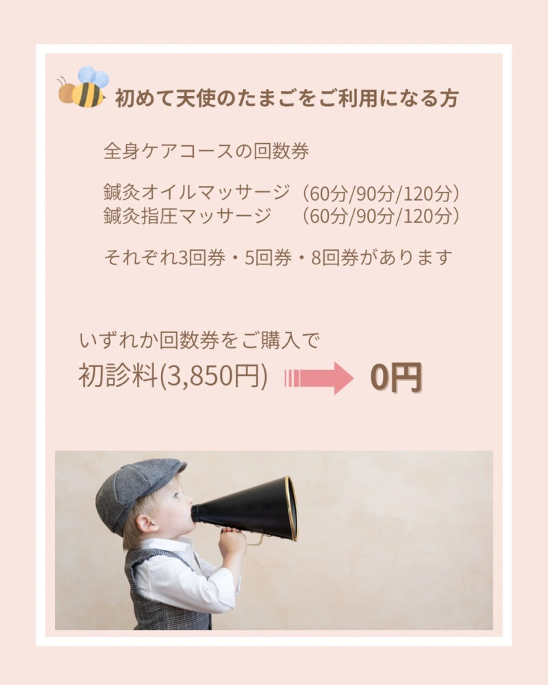初回ご来院時にボディのコースの回数券をご購入いただきますと、初診料無料にてご案内させていただきます。
