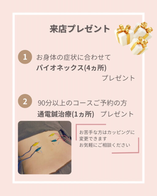 期間中にご来院の方、全員に置き鍼をサービスさせていただきます。