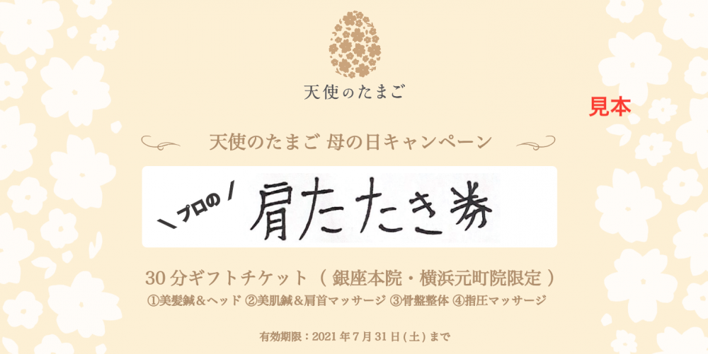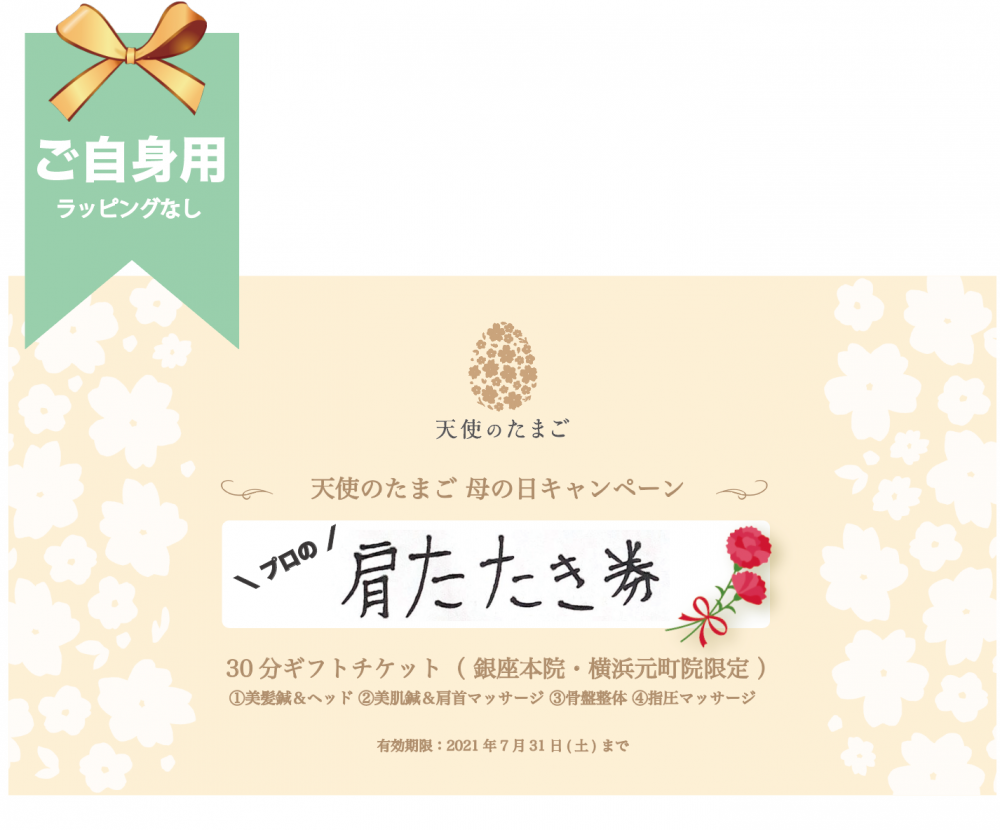 天使のたまごの『母の日キャンペーン肩たたき券』は、日頃妊産婦さんのケアをしている国家資格保有者のプロの肩たたき券ですので、ご安心してお受けいただけるメニューを揃えています。マッサージが初めて!というお母様にも胸を張っておすすめできますよ♪