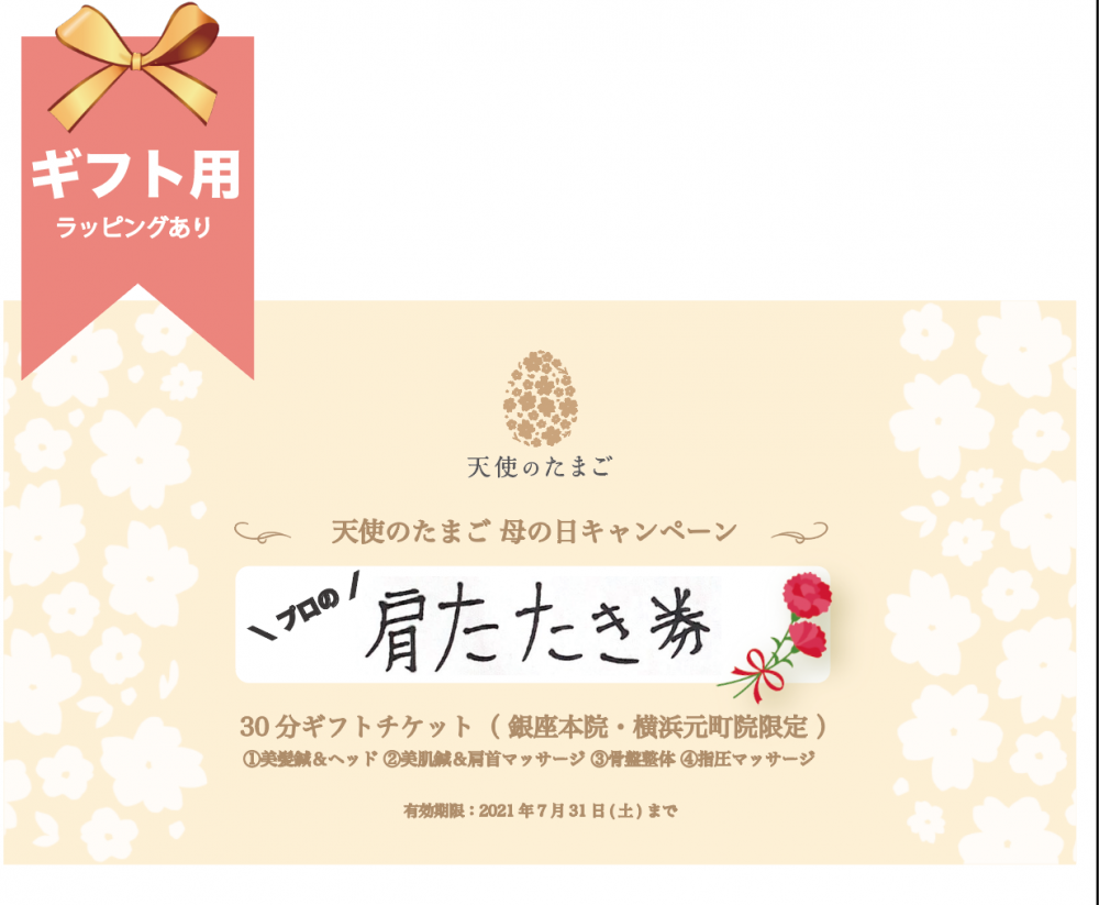 そして、天使のたまごにお通いいただいている方が、ご家族やご友人に天使のたまごをご紹介いただき、その方が施術を受けられた場合にはご紹介者様・ご紹介された方のどちらにも『3000円分のギフトチケット』を進呈いたしております。