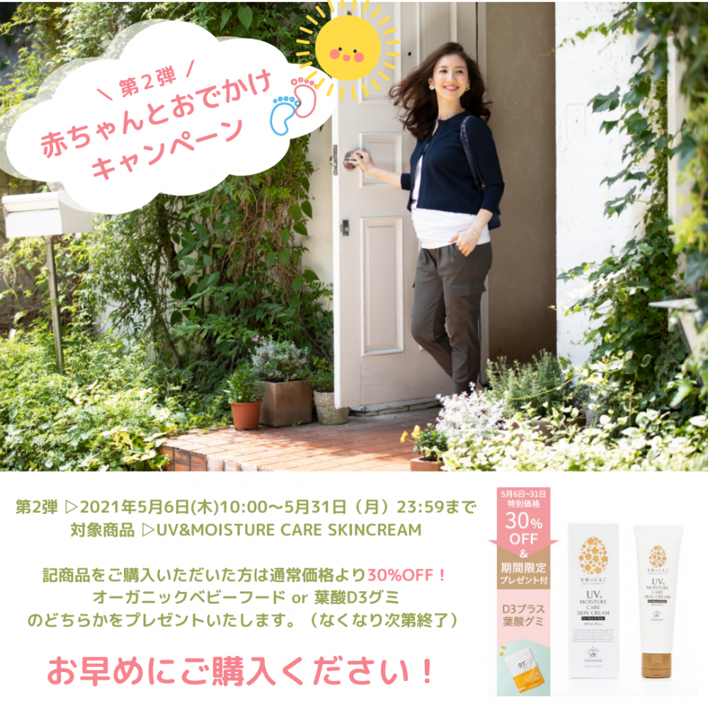 妊娠中から産後のデリケートなお肌を紫外線から守り、お肌に負担をかけずに落とすことができる、赤ちゃんも使える低刺激処方の日焼け止め保湿クリーム。日差しが強くなるこれからの季節、赤ちゃんとのお出かけの際にぜひ親子でお使いください。