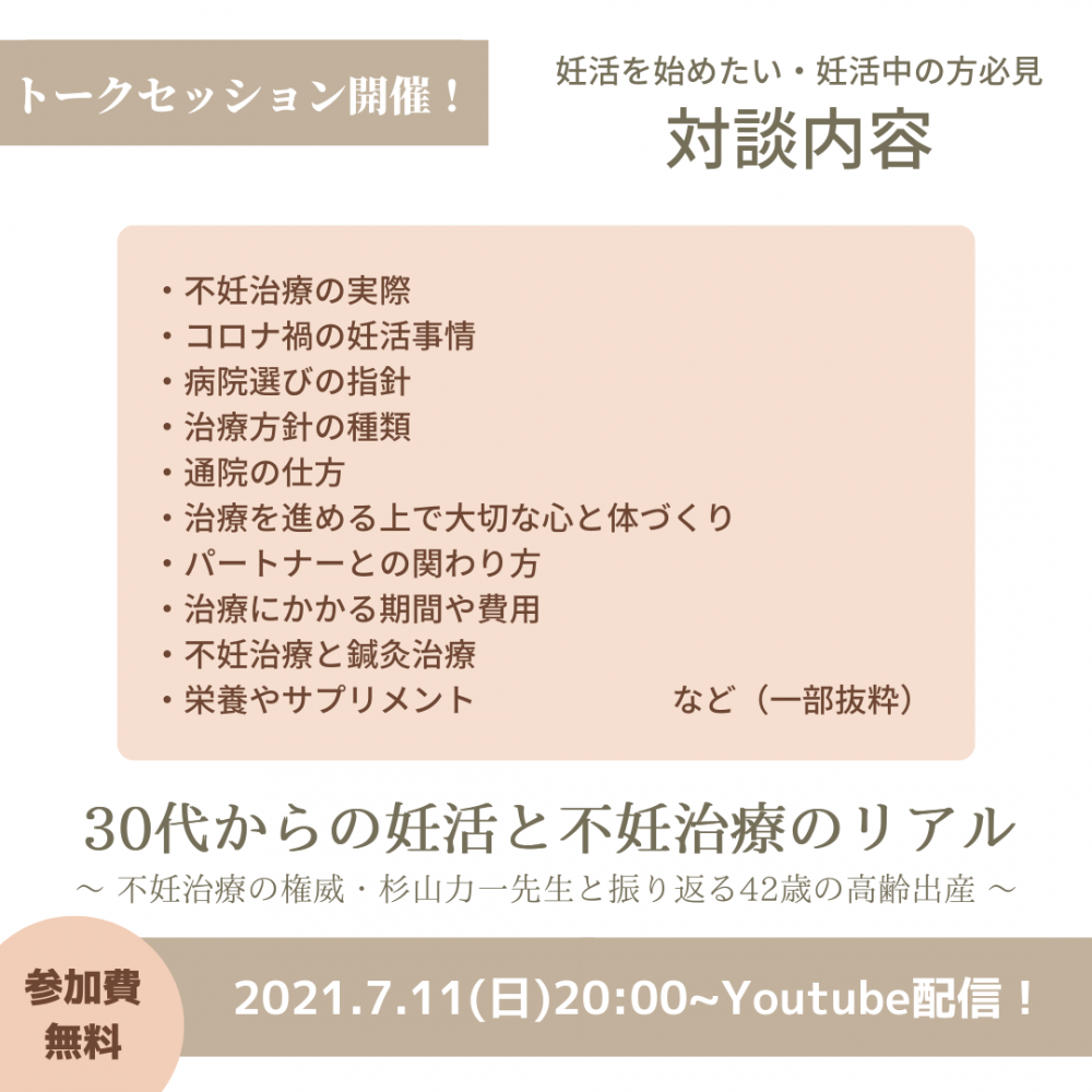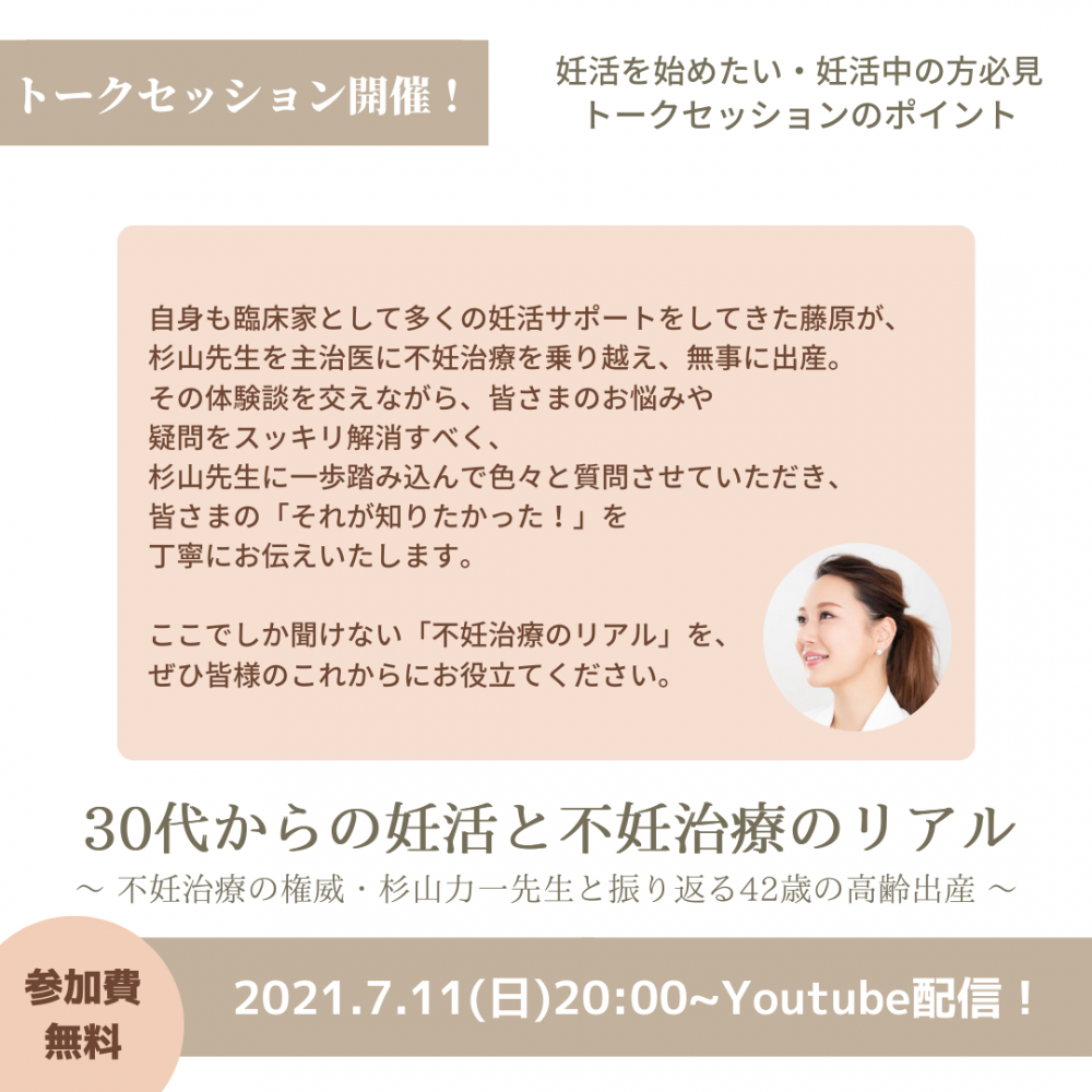 不妊治療の権威・杉山力一先生をお迎えして、自らも不妊治療を経験し、42歳で妊娠・出産を経た天使のたまご代表藤原との”ここでしか聞けない”トークセッションを開催します!