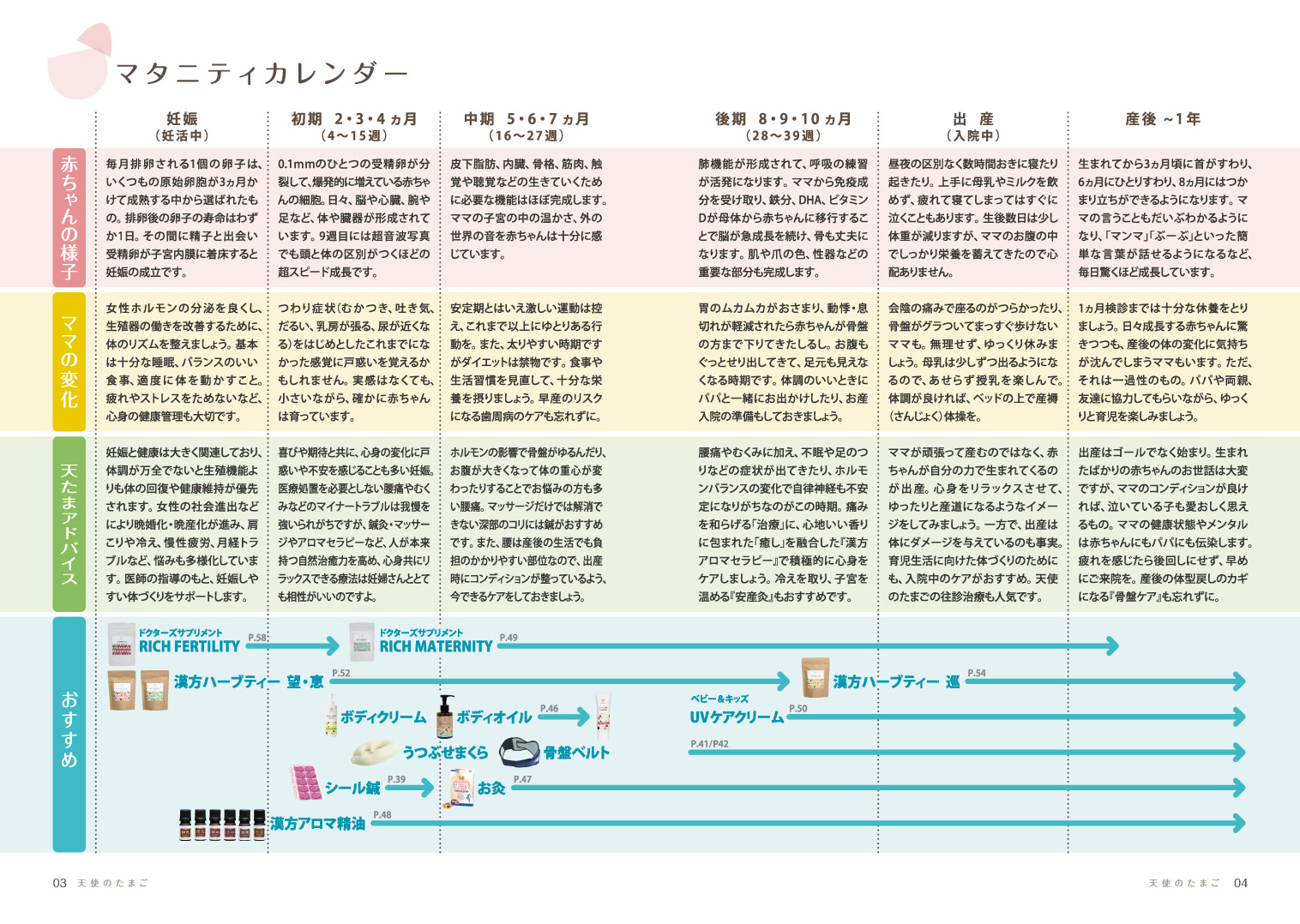赤ちゃんが健やかに生まれるための「母子手帳」があるように、これからは、ママとなる女性がクオリティ・オブ・ライフを損なうことなく、いつまでも美しく、生き生きとマタニティライフを過ごすためのママのための手帳が必要…。この天たま手帳 (Maternity Body Care Perfect Guide)は、私たちのそんな想いと、これまでの5万件にのぼる臨床経験から生まれました。