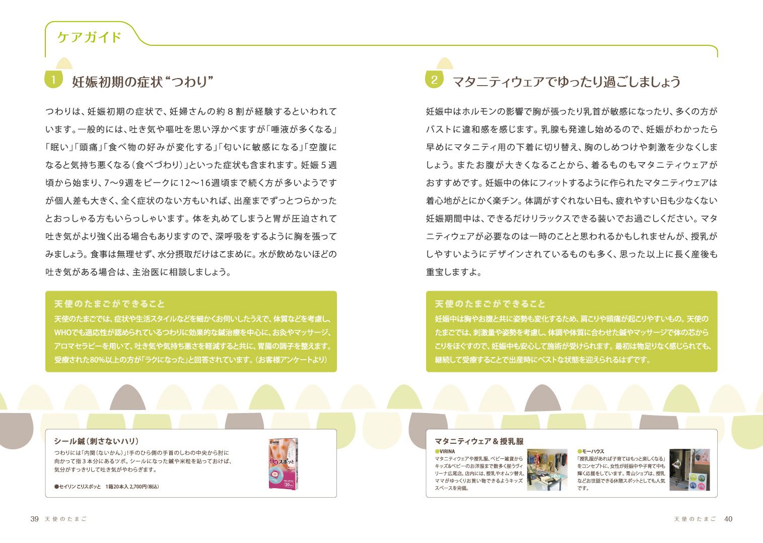 「天使のたまご」に来院される妊産婦さんの声をまとめ、妊娠中のセルフケア方法やオススメグッズなど、様々なお悩みや疑問に対する解決の糸口を紹介する妊娠〜出産、子育てのガイドブックです。