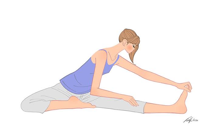 足を伸ばした状態でつま先をつかみ、ゆっくりと息を吐きながら自分の方に引き寄せます。