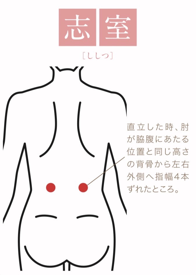 胃の裏側に胃兪(いゆ)と呼ばれるツボがあります。直立し両肘を結んだ線上の高さで、背骨から左右指幅2本分外側にあります。