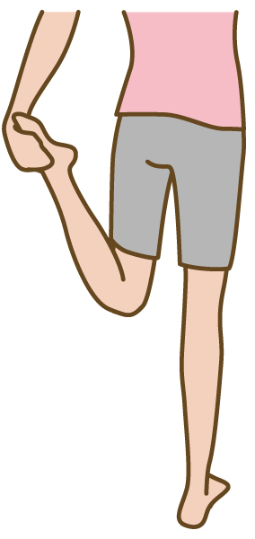 ①壁や手すりを持った状態で反対の手で足首を持ちます。