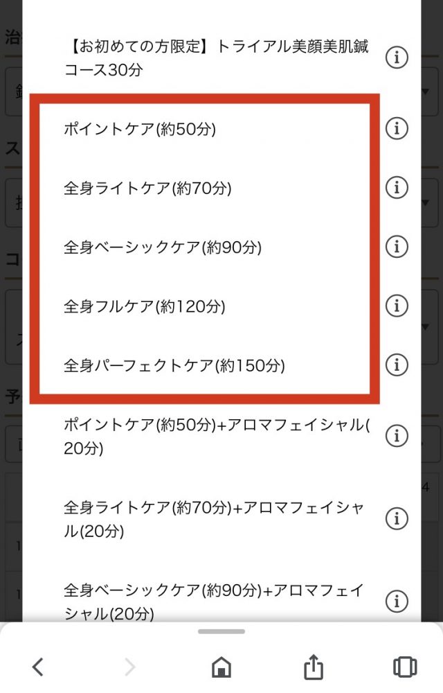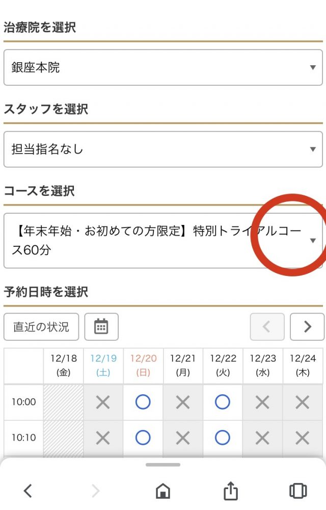 そして、こちらの『予約画面はこちら』をタップしていただくと、ご予約画面に進むことができます。