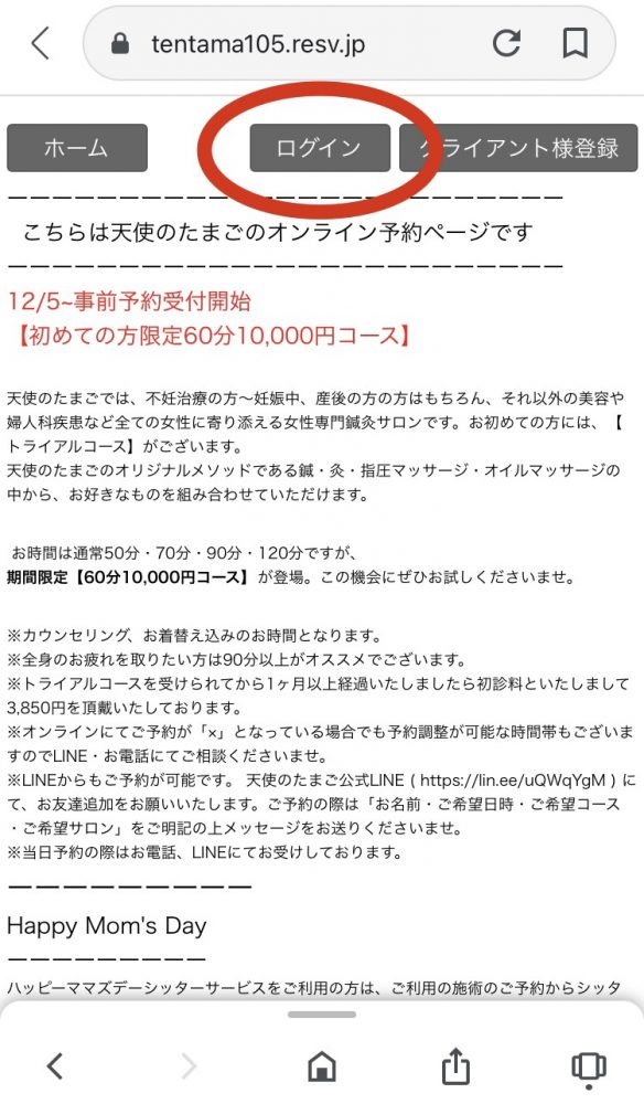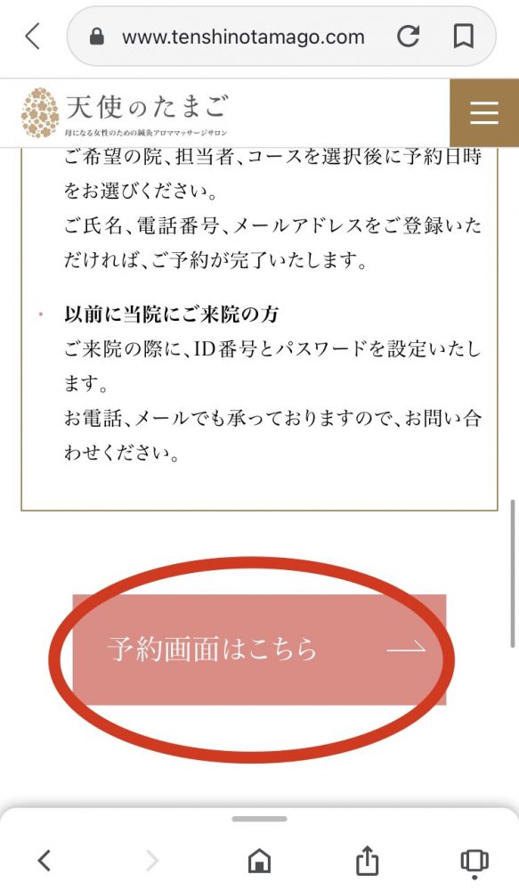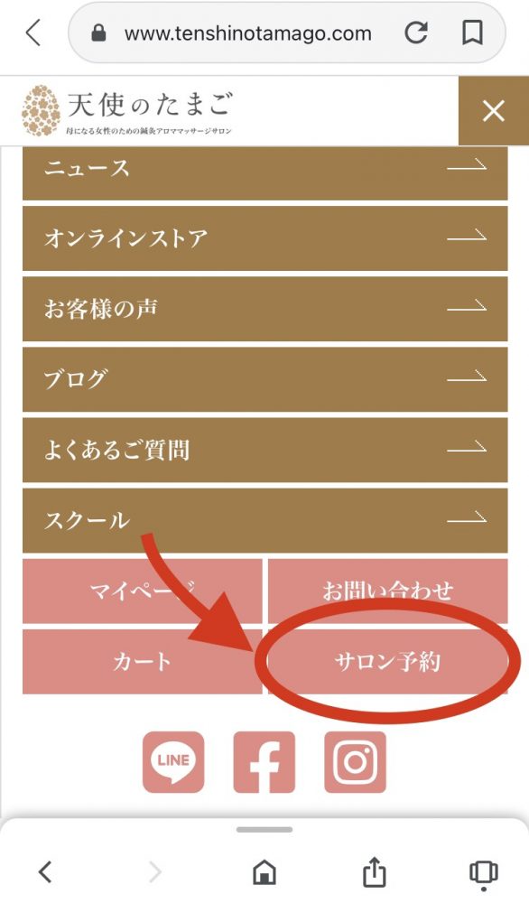 こちらの『サロン予約』から、天使のたまご施術予約に進むことができます。